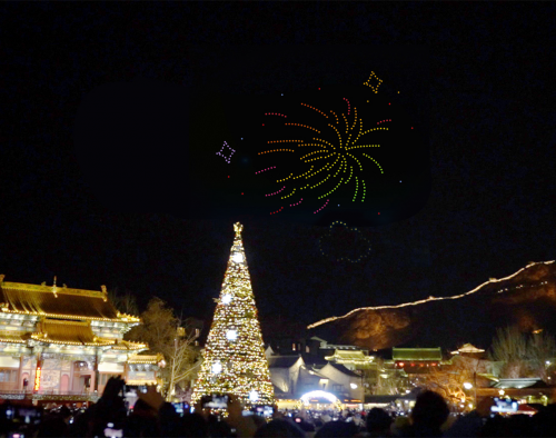 据了解,古北水镇精心策划了两场400架无人机表演节目,一款是专为春节定制的无人机图案,将节日的喜庆氛围推向极致;另一款是无人机的模拟烟花秀,满足游客过年时对烟花的深切向往,更以环保、安全的方式展现烟花的美丽与震撼。