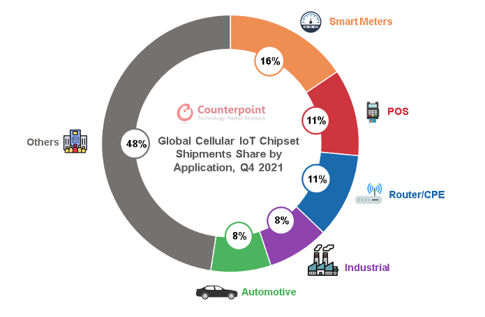 2021年第四季度全球蜂窝物联网芯片出货量份额(按应用划分)
