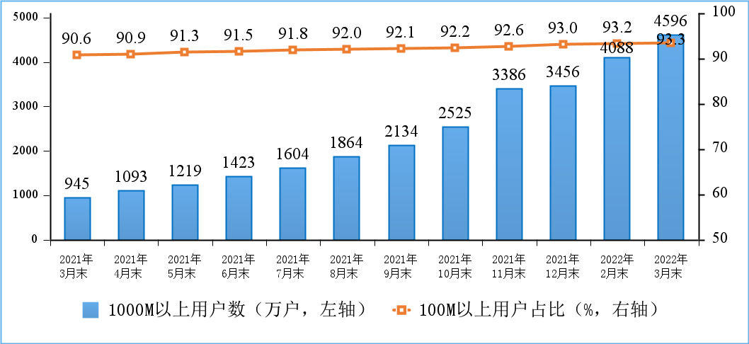 固定宽带接入用户规模稳步增长,千兆用户数持续扩大。截至3月末,三家基础电信企业的固定互联网宽带接入用户总数达5.51亿户,比上年末净增1513万户。其中,100Mbps及以上接入速率的固定互联网宽带接入用户达5.14亿户,占总用户数的93.3%,占比较上年末提升0.3个百分点;1000Mbps及以上接入速率的固定互联网宽带接入用户达4596万户,比上年末净增1140万户。