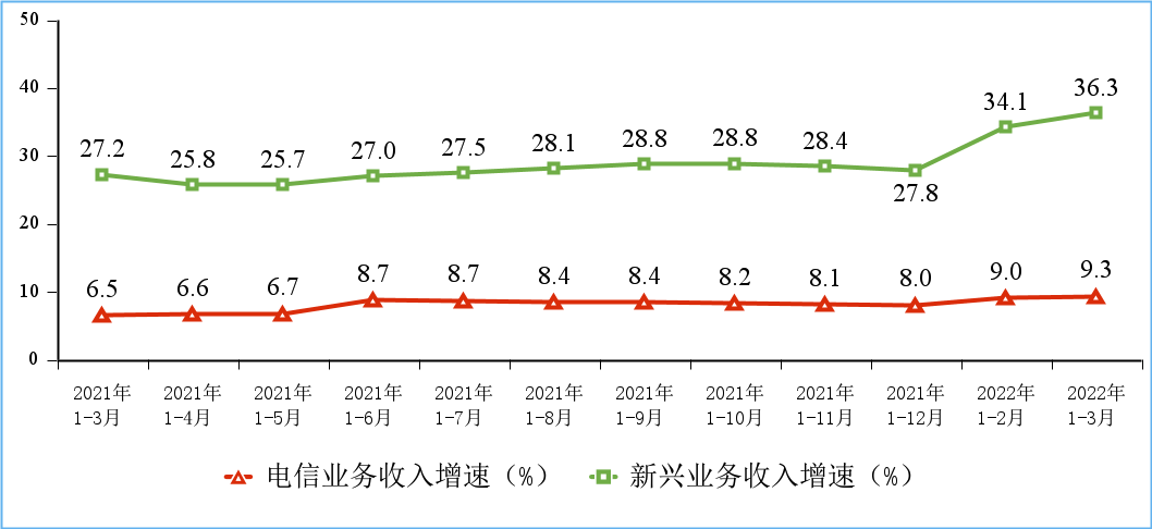 一季度,通信业整体运行平稳向好。电信业务收入增速提升,电信业务总量较快增长;5G和千兆光网等新型基础设施建设和应用稳步推进,通信供给能力不断增强;云计算等新兴业务增势突出,移动数据流量持续快速增长,行业发展新动能持续增强。