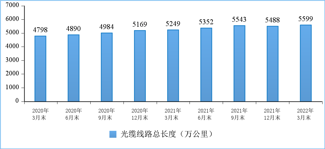 光缆线路总长度持续增加。截至3月末,全国光缆线路总长度达到5599万公里,比上年末净增111万公里。其中接入网光缆、本地网中继光缆和长途光缆线路所占比重分别为65.1%、32.8%和2.1%,接入网光缆比重同比提高2.5个百分点。