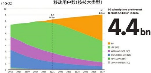 爱立信发布的最新版《移动市场报告》预测,到今年年底,全球5G用户数将超过10亿,并在五年后,即2027年,达到44亿,占全球91亿移动连接数的近一半。