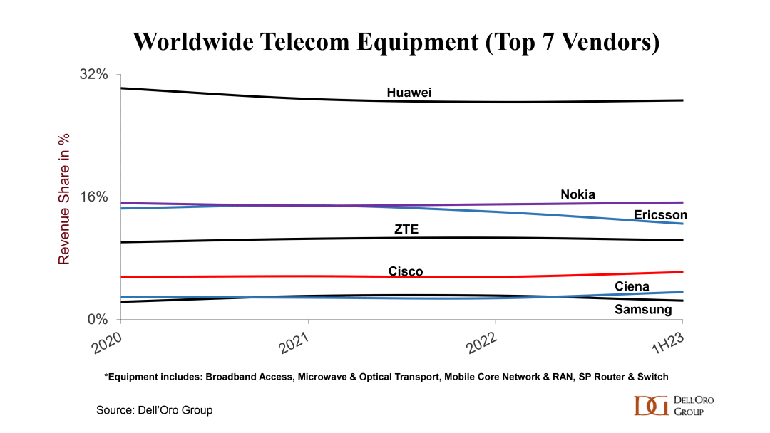 Stefan Pongratz表示,2022年至2023年上半年,供应商动态基本保持稳定,但也有少数例外。Ciena超越了三星,诺基亚和爱立信之间的差距拉大,这在一定程度上反映了无线和有线技术的组合。尽管美国政府一直在努力限制华为的潜在市场,限制该公司使用最新的芯片,但Dell'Oro Group的分析显示,华为仍然在全球电信设备市场处于领先地位。这在一定程度上是因为华为在Dell'Oro Group追踪的六个细分电信领域中的五个领域仍然是排名第一的供应商,而且华为继续主导北美以外的市场,占2013年上半年收入的35%至40%。
