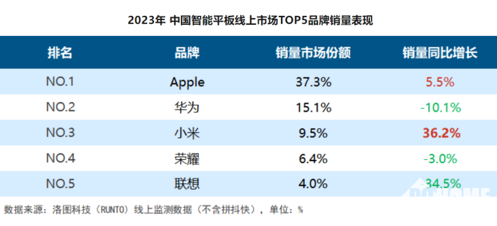 根据洛图科技(RUNTO)线上监测数据,2023年线上监测市场的TOP5品牌为苹果、华为、小米、荣耀、联想。苹果占比为37.3%,销量份额稳居线上监测市场的第一;华为以15.1%的市场份额稳居国内厂商的领头地位,这得益于其8月份麒麟芯片回归;小米位居线上监测市场的第三,销量同比增长36.2%,成为TOP5品牌中涨幅最大的品牌;荣耀销量占比为6.4%,排名线上监测市场第四。