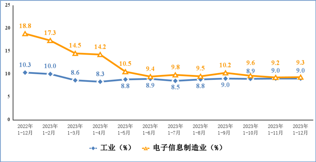 规模以上电子信息制造业增加值同比增长3.4%,增速比同期工业低1.2个百分点,但比高技术制造业高 0.7 个百分点。12 月份,规模以上电子信息制造业增加值同比增长 9.6%。