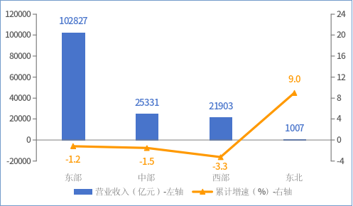 此外,2023 年,规模以上电子信息制造业东部地区实现营业收入 102827 亿元,同比下降 1.2%;中部地区实现营业收入 25331 亿元,同比下降 1.5%;西部地区实现营业收入 21903 亿元,同比下降 3.3%;东北地区实现营业收入 1007 亿元,同比增加 9%。四个地区电子信息制造业营业收入占全国比重分别为 68.1%、16.8%、14.5% 和 0.7%。