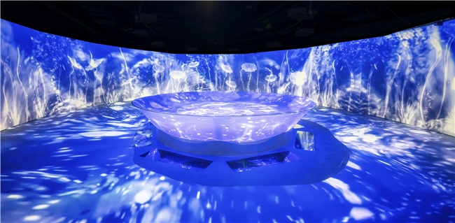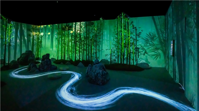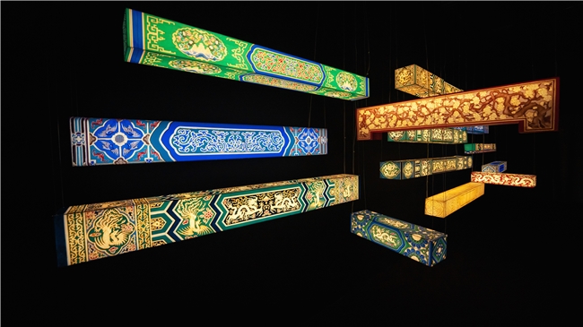 在展览中,观众可以直观地欣赏到数字技术如何使传统纹样焕发新生。展馆中庭区域以裸眼3D形式新生的数字文物全方位展现了纹样的灵动之美;脱胎于自然的莲花、鹭鸶、枇杷、鲤鱼等纹样在数字化光影中重发焕彩,古人对自然与生活的细致观察与丰富想象在“‘纹’法自然”展区得以具象化;在“纹窗弄影”展区,观众可穿梭在宫墙间,感受三交六菀菱花窗影旁的故宫四季;在“流光溢彩”展区,动态光影的流动交织赋予了云龙纹、海水龙纹、缠枝莲纹、蝠桃纹蓬勃的生命力与无尽延展的空间感,观众仿佛步入由纹样构建的瑰丽梦境;“锦绣世界”展区以万花筒形式呈现了乾隆款画珐琅团锦花纹盖罐等器物上丰富多彩的纹样组合,把传统纹样化作绚丽多变的视觉奇观;“梦幻江南”则利用虚拟现实技术生动还原了故宫倦勤斋的室内戏台区域,带领观众进入乾隆皇帝对于江南的遐想空间。
