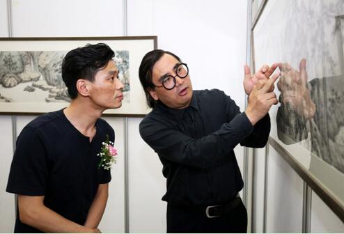 展览如同一次检阅,图为朱赓博聆听刘万鸣先生对作品的点评