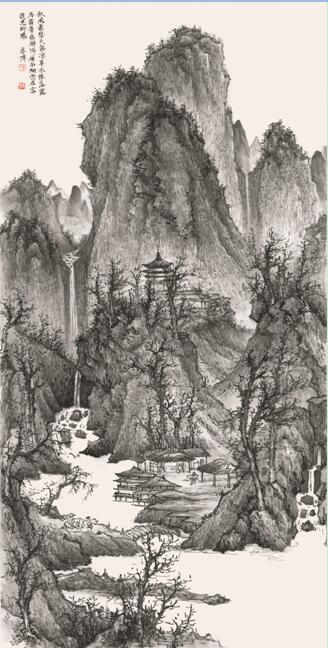 《秋山萧寺》 136cmx70cm 纸本水墨 2016年