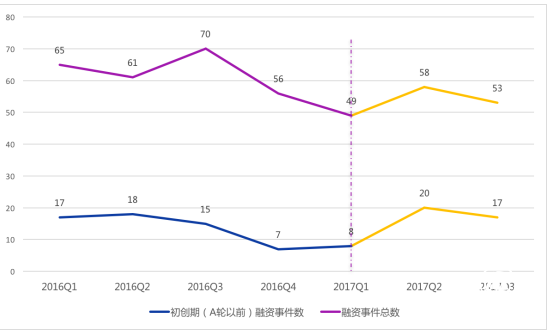 2017年Q2-Q3季度,与此相称,中后期项目(B轮后)融资事件比例大幅下降,已在Q1季度集中完成融资的项目将开始规模化冲刺,尚未完成融资的项目或将迎来更加严峻的融资环境。