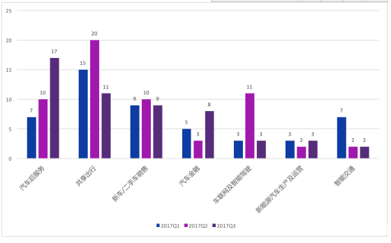2017年Q3,汽车交通出行录入初创项目融资17起,环比2017年Q2下降15%,但相比2017年Q1依然增长112.5%;同比2016年Q3增长13%。