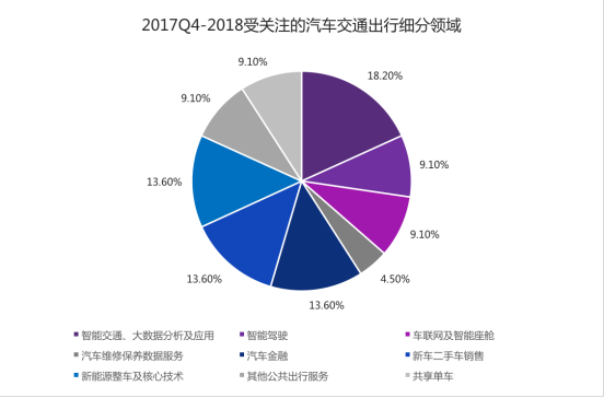 可以看出,2017年Q4-2018年,投资机构看好的汽车交通出行细分领域中,单项细分领域,智能交通成为广泛被看好的方向,但新车、二手车销售联手汽车金融服务的应用,将在资本市场掀起强烈热度。同时,新能源汽车及核心技术的创新也将受到非常大的关注。
