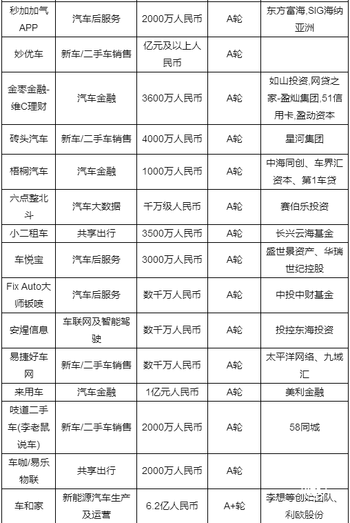 (2)新车、二手车销售领域投融资事件依旧强劲(如下表),汽车销售大数据的获取与精准导流、交易场景的构建与消费撮合,以及对汽车金融产品的灵活应用,将极大降低汽车消费门槛,提高购车体验与交易效率,缩短决策流程;同时,渠道的下沉也将让更多新车、二手车消费场景发生在三四五线城市的消费群体中。