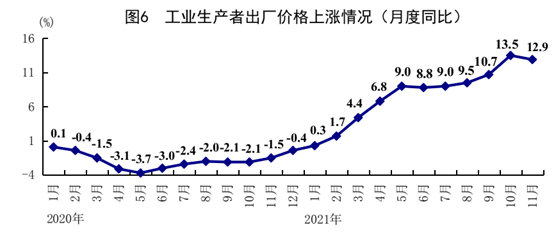11月份,全国工业生产者出厂价格同比上涨12.9%,涨幅比上月回落0.6个百分点;环比持平。工业生产者购进价格同比上涨17.4%,涨幅比上月扩大0.3个百分点;环比上涨1.0%。1-11月份,全国工业生产者出厂价格、工业生产者购进价格同比分别上涨7.9%、10.7%。