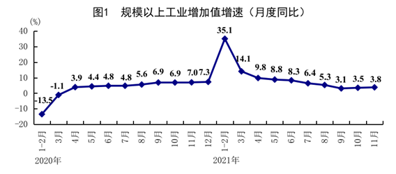 11月份,全国规模以上工业增加值同比增长3.8%,比上月加快0.3个百分点;两年平均增长5.4%,比上月加快0.2个百分点;环比增长0.37%。分三大门类看,采矿业增加值同比增长6.2%,制造业增长2.9%,电力、热力、燃气及水生产和供应业增长11.1%。高技术制造业增加值同比增长15.1%,比上月加快0.4个百分点;两年平均增长12.9%。分产品看,新能源汽车、工业机器人、集成电路产量同比分别增长112.0%、27.9%、11.9%。分经济类型看,国有控股企业增加值同比增长3.6%;股份制企业增长4.5%,外商及港澳台商投资企业增长1.9%;私营企业增长3.9%。1-11月份,全国规模以上工业增加值同比增长10.1%,两年平均增长6.1%。11月份,制造业采购经理指数为50.1%。1-10月份,全国规模以上工业企业实现利润总额71650亿元,同比增长42.2%,两年平均增长19.7%;规模以上工业企业营业收入利润率为7.01%,同比提高1.04个百分点。