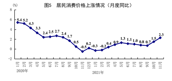 11月份,全国居民消费价格(CPI)同比上涨2.3%,涨幅比上月扩大0.8个百分点;环比上涨0.4%。分类别看,食品烟酒价格同比上涨1.7%,衣着价格上涨0.5%,居住价格上涨1.7%,生活用品及服务价格上涨0.5%,交通通信价格上涨7.6%,教育文化娱乐价格上涨3.0%,医疗保健价格上涨0.6%,其他用品及服务价格下降0.6%。在食品烟酒价格中,猪肉价格同比下降32.7%,粮食价格上涨1.5%,鲜果价格上涨4.1%,鲜菜价格上涨30.6%。扣除食品和能源价格后的核心CPI同比上涨1.2%,涨幅比上月回落0.1个百分点。1-11月份,全国居民消费价格同比上涨0.9%。