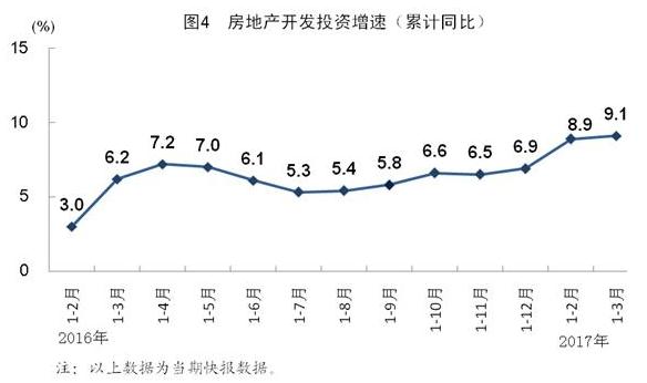 1-3月份全国房地产开发投资同比增长9.1%,创2015年3月以来最快增速。1-3月份,全国房地产开发投资19292亿元,同比名义增长9.1%,增速比1-2月份提高0.2个百分点。1-3月份,商品房销售面积29035万平方米,同比增长19.5%,增速比1-2月份回落5.6个百分点。商品房销售额23182亿元,增长25.1%,增速回落0.9个百分点。1-3月份,房地产开发企业房屋施工面积636977万平方米,同比增长3.1%,增速比1-2月份回落0.1个百分点。