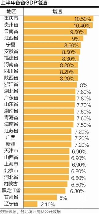 按此计算,重庆、贵州、云南上半年经济增速分别为10.5%、10.4%、9.5%,居其后。