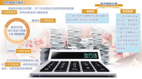今年以来,地方政府债券发行节奏总体较为平稳。根据年初通过的预算,2017年全国地方政府新增债券规模1.63万亿元,并同时继续发行置换债券。据评级机构中债资信统计,截至8月底,地方债发行规模为3.18万亿元,其中置换债1.9万亿元,新增债1.28万亿元;一般债1.81万亿元,专项债1.36万亿元。