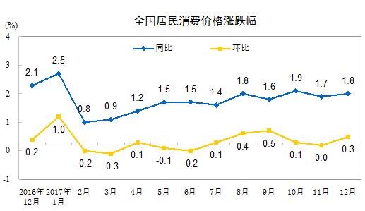 国家统计局今日公布2017年12月CPI,数据显示,2017年12月份,全国居民消费价格同比上涨1.8%。其中,城市上涨1.9%,农村上涨1.7%;食品价格下降0.4%,非食品价格上涨2.4%;消费品价格上涨1.1%,服务价格上涨3.0%。12月份,全国居民消费价格环比上涨0.3%。其中,城市上涨0.3%,农村上涨0.4%;食品价格上涨1.1%,非食品价格上涨0.1%;消费品价格上涨0.5%,服务价格上涨0.1%。