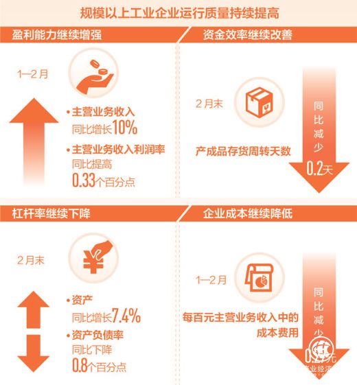 资金效率继续改善。2月末,规模以上工业企业产成品存货周转天数为17.4天,同比减少0.2天;应收账款平均回收期为47.4天,同比减少0.2天。