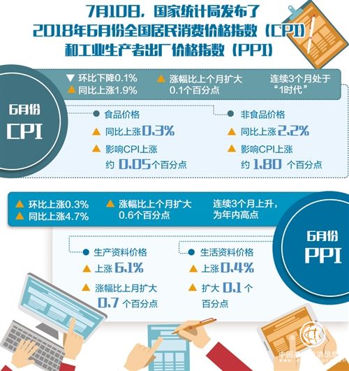 7月10日,国家统计局发布了2018年6月份全国居民消费价格指数(CPI)和工业生产者出厂价格指数(PPI)。数据显示,6月份CPI环比下降0.1%,同比上涨1.9%;PPI环比上涨0.3%,同比上涨4.7%。