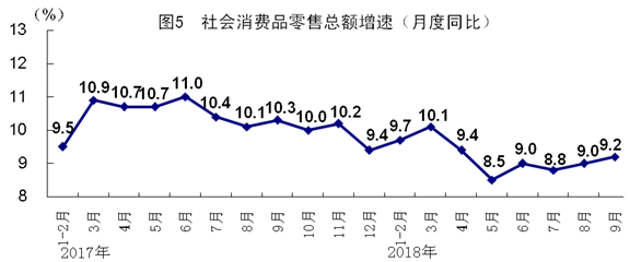 前三季度,社会消费品零售总额274299亿元,同比增长9.3%,增速比上半年回落0.1个百分点。按经营单位所在地分,城镇消费品零售额234717亿元,增长9.1%;乡村消费品零售额39582亿元,增长10.4%。按消费类型分,餐饮收入29763亿元,增长9.8%;商品零售244536亿元,增长9.2%。消费升级类商品销售增长较快,在限额以上单位商品零售额中,石油及制品类、通讯器材类同比分别增长14.4%和10.7%,比上年同期分别加快5.4和1.4个百分点。9月份,社会消费品零售总额同比增长9.2%,比上月加快0.2个百分点。前三季度,全国居民人均消费支出14281元,同比名义增长8.5%,比上年同期加快1.0个百分点;扣除价格因素实际增长6.3%,加快0.4个百分点。其中,城镇居民人均消费支出名义增长6.5%,加快0.3个百分点;农村居民人均消费支出名义增长12.0%,加快3.4个百分点。