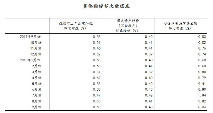 (2)根据季节调整模型自动修正结果,对近一年来各期国内生产总值、规模以上工业增加值、固定资产投资(不含农户)、社会消费品零售总额环比增速进行修订。修订结果及2018年三季度GDP环比数据、9月份其他指标环比数据如下: