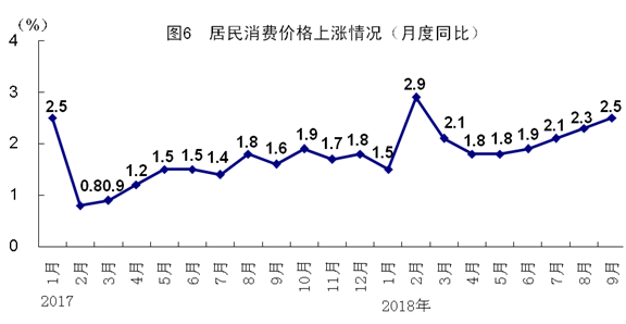 前三季度,全国居民消费价格同比上涨2.1%,涨幅比上半年扩大0.1个百分点。分类别看,食品烟酒价格同比上涨1.6%,衣着上涨1.2%,居住上涨2.4%,生活用品及服务上涨1.6%,交通和通信上涨1.7%,教育文化和娱乐上涨2.2%,医疗保健上涨5.0%,其他用品和服务上涨1.1%。9月份,全国居民消费价格同比上涨2.5%,涨幅比上月扩大0.2个百分点,环比上涨0.7%。前三季度,全国工业生产者出厂价格同比上涨4.0%,涨幅比上半年扩大0.1个百分点;工业生产者购进价格同比上涨4.5%。9月份,全国工业生产者出厂价格同比上涨3.6%,涨幅比上月缩小0.5个百分点,环比上涨0.6%;工业生产者购进价格同比上涨4.2%,环比上涨0.6%。