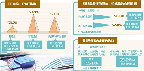 专家表示,受“十一”长假、外部环境复杂多变等因素影响,制造业供需虽然出现了一些波动,但仍位于扩张区间,总体继续保持增长。非制造业商务活动指数虽然有所放缓,但仍处高位。总的来看,尽管制造业和非制造业PMI双双回落,但企业对于未来的生产经营预期基本稳定,宏观经济具备实现平稳健康运行条件。