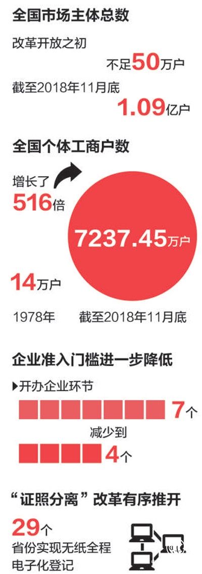近年来,在商事制度改革不断深入的大背景下,我国市场主体数量节节攀升,新设企业速度明显加快。我国市场主体从改革开放之初的不足50万户,到2018年11月底,全国实有市场主体1.09亿户。特别是近5年来,我国各类市场主体总量增加70%以上。
