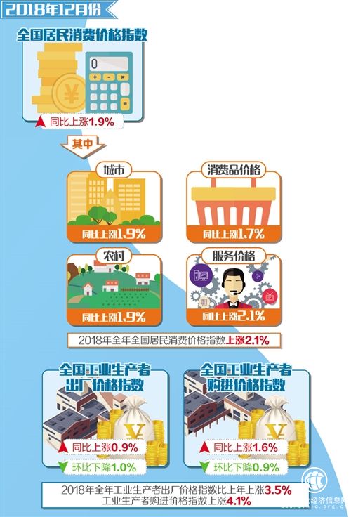 2019年1月10日,国家统计局发布了全国居民消费价格指数(CPI)和工业生产者出厂价格指数(PPI)数据。2018年全年,CPI同比上涨2.1%,同比涨幅比上年扩大0.5个百分点,完成了年初提出的“居民消费价格涨幅3%左右”预期目标;PPI同比上涨3.5%,涨幅比上年回落2.8个百分点。