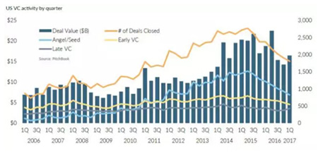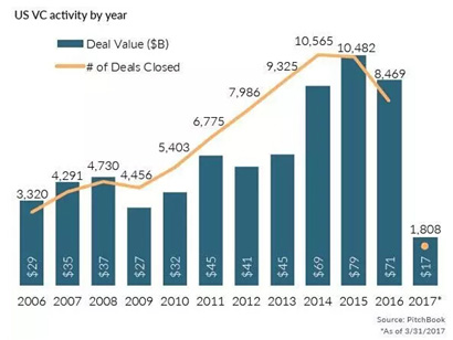 相比于2014年、2015年的持续火热,2016年的美国风险投资市场有些趋冷。进入2017年,早期的迹象显示今年将回归到一个健康的风险投资年份。