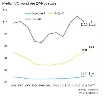 天使和种子轮次是出现投资数量最大幅度下降的阶段,这也是整体投资数量下降的最主要原因。但从各阶段投资金额的中位数来看,基本与2016年持平。
