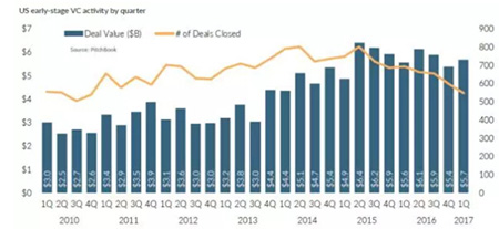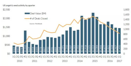 投资交易数量最明显的下降就发生在天使和种子阶段。2017年第一季度827笔交易共募集15亿美元的金额,分别同比下降14%和62%,连续第七个季度下降。