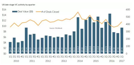 整体看来,交易活动回归到平均水平是好的,2014年和2015年的投资市场太过火热,导致许多非风险投资者都纷纷涌向该市场,将额外的资本都投入进来,导致估值飙升。退出缓慢、流动性不足使投资者更理性,也让风险投资回到更可持续的后期投资。