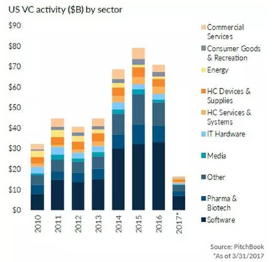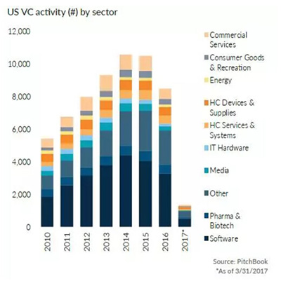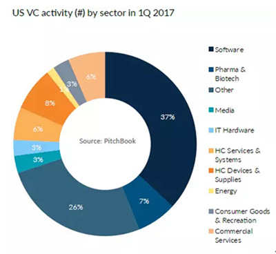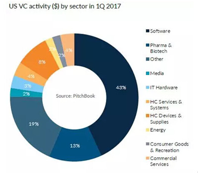 软件行业仍然是占比最高的行业,2017年第一季度达到了37%,但从趋势上看占比呈下降趋势。同样占比下降的还有消费品和娱乐行业,以及商业服务行业。制药和生物科技的占比在持续增长。