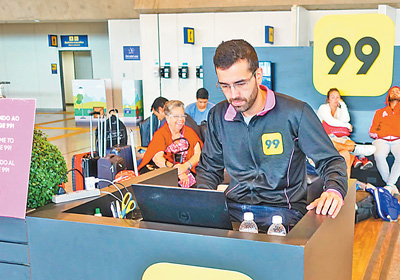 巴西里约热内卢国际机场设有99公司服务区,供乘客在此叫车等候。图为正在工作的99公司员工。(人民日报记者 张远南 摄)