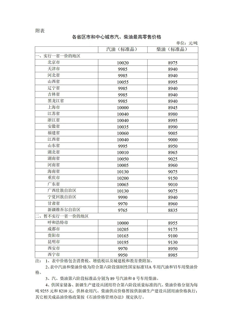 附:各省区市和中心城市汽、柴油最高零售价格