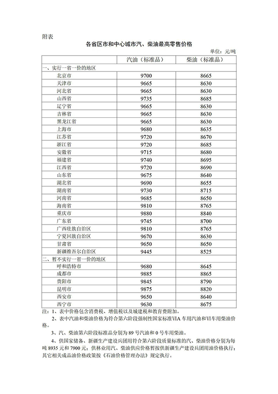 根据近期国际市场油价变化情况,按照现行成品油价格形成机制,自2023年2月3日24时起,国内汽、柴油价格(标准品,下同)每吨分别提高210元和200元。调整后,各省(区、市)和中心城市汽、柴油最高零售价格见附表。相关价格联动及补贴政策按现行规定执行。