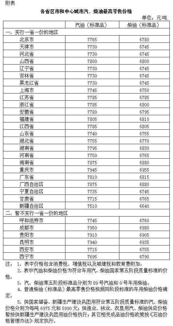根据近期国际市场油价变化情况,按照现行成品油价格形成机制,自2017年5月11日24时起,国内汽、柴油价格(标准品,下同)每吨分别降低250元和235元。调整后,各省(区、市)和中心城市汽、柴油最高零售价格见附表。相关价格联动及补贴政策按现行规定执行。