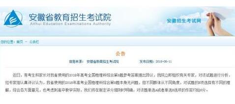 上述省份招生部门发布说明称,经学科专家评议认为,该题本身没有问题,但不同考生从不同学科角度,对试题选项会有不同的理解。综合各方面意见,考虑高中教学的实际等因素,经研究决定,在该省理科综合科目评卷中,对该题单选A或单选B的,均给6分。