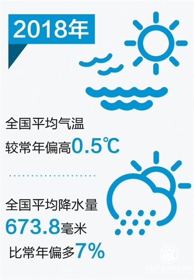 国家气候中心副主任张强介绍,2018年,全国平均气温(10.1℃)较常年偏高0.5℃;春夏季气温创历史新高,秋冬季气温接近常年同期。高温日数多,东北及中东部地区高温极端性突出。全国平均降水量673.8毫米,比常年偏多7%。全国年降水资源总量为63937亿立方米,比常年偏多4174亿立方米,属于丰水年份,其中黑龙江、四川、甘肃、青海、宁夏属于异常丰水年份。