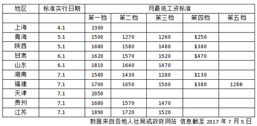 经过今年上半年的调整后,上海、天津的月最低工资标准超过了2000元大关。其中上海月最低工资标准2300元,为全国最高;天津月最低工资标准今年是首次突破2000大关,达到2050元。