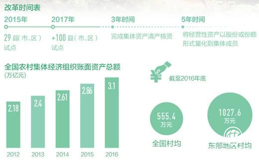 2014年9月,中央全面深化改革领导小组第五次会议审议了《积极发展农民股份合作赋予集体资产股份权能改革试点方案》。2015年29个县市区参与改革试点,2017年新增100个试点。2017年开始,将用3年基本完成集体资产清产核资,再用5年基本完成经营性资产股份合作制改革,将经营性资产以股份或份额形式量化到集体成员。两年多来,集体家底更清晰了,群众心里更明白了,发展集体经济的劲头更足了。