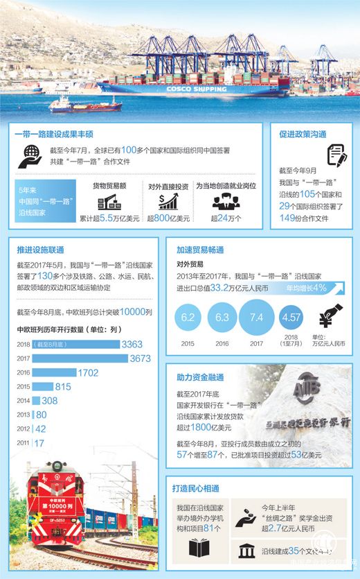 2018年是“一带一路”倡议提出5周年。2013年,习近平主席在哈萨克斯坦和印度尼西亚提出共建“一带一路”倡议,得到积极响应;截至今年7月,全球已有100多个国家和国际组织同中国签署共建“一带一路”合作文件。