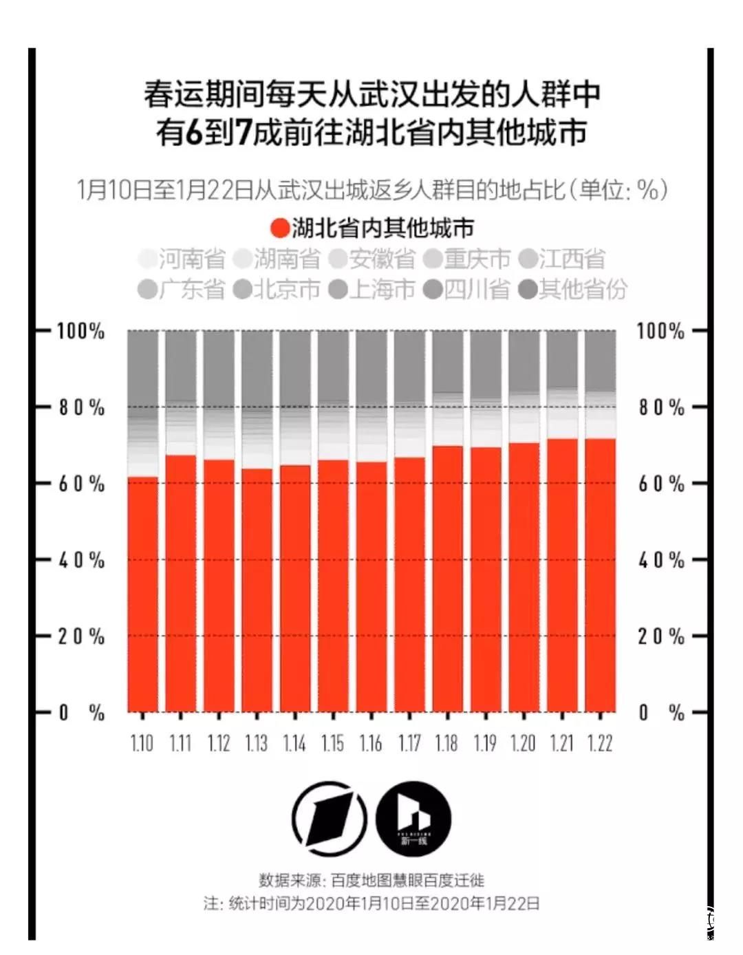 第一财经·新一线城市研究所引用百度地图慧眼的迁徙大数据也显示,1月10日至1月22日春运期间(武汉封城之前),每天从武汉出发的人群中有6至7成的人前往了湖北省内的其他城市,其次是河南省、湖南省、安徽省、重庆市、江西省。