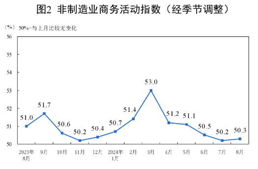 8月份,非制造业商务活动指数为50.3%,比上月上升0.1个百分点,非制造业景气水平略有回升。