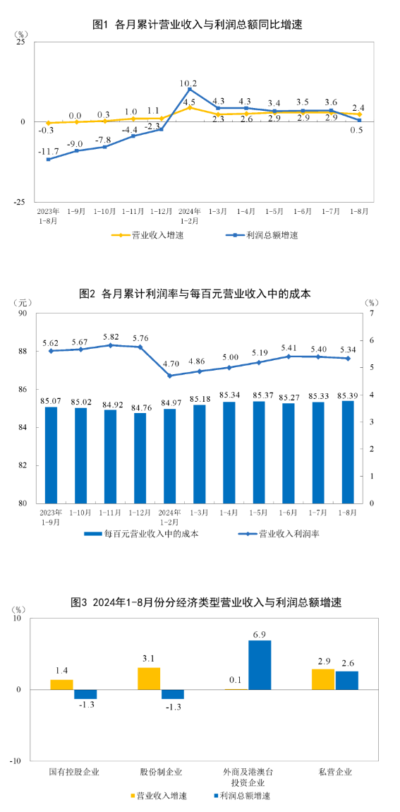 1—8月份,规模以上工业企业实现营业收入87.10万亿元,同比增长2.4%;发生营业成本74.38万亿元,增长2.6%;营业收入利润率为5.34%,同比下降0.10个百分点。