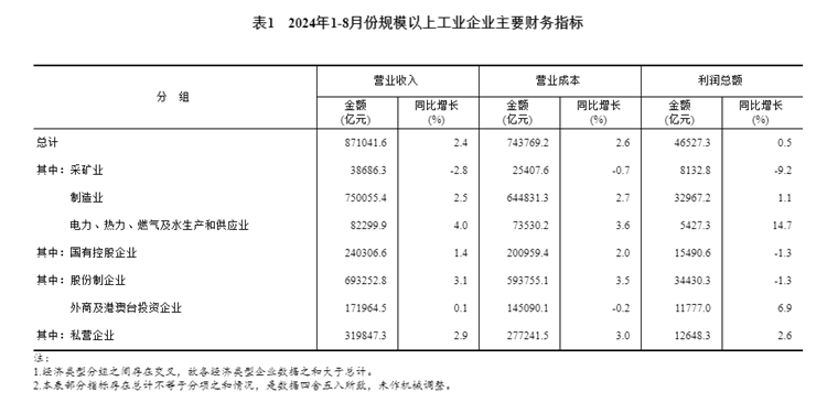1—8月份,全国规模以上工业企业实现利润总额46527.3亿元,同比增长0.5%(按可比口径计算,详见附注二)。